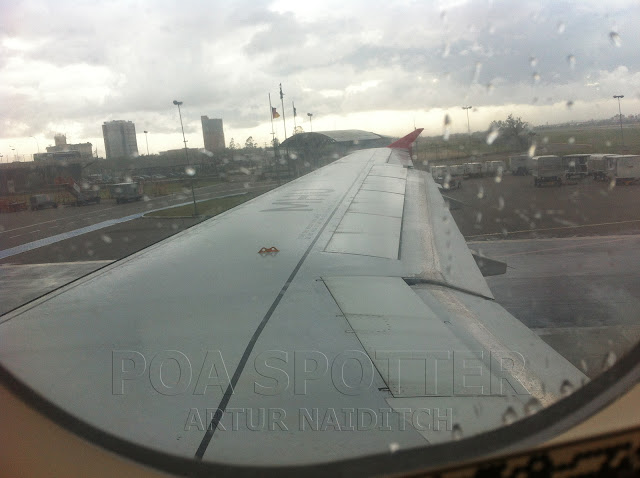 Feito o embarque de todos e passado a hora prevista para a decolagem vem um aviso do comandante dizendo que duas pessoas haviam feito o check-in e despachado as suas malas mas não haviam embarcado, resolvido os problema com as malas a aeronave estava pronta para partir. Então começou a chuva que veio forte e acabou por causar um atraso de mais trinta minutos. Após a chuva ter aliviado seguimos em direção a cabeceira 29 para a decolagem.